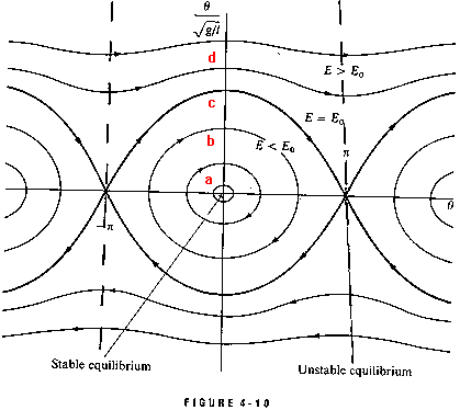 1) A "phase diagram" for a nonlinear system provides a visual or graphical way of considering the behavior in time of the system. The figure to the right (Figure 4.10 from the text) shows a "phase diagram" for a plane pendulum. On the phase diagram's horizontal axis is q(t), the angular displacement of the pendulum bob (measured from the vertical) as a function of time. On the phase diagram's vertical axis is dq/dt, the time derivative of q, divided by a normalization constant ([g/l]1/2).