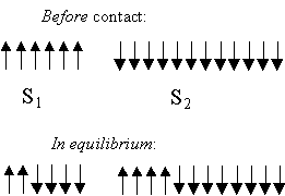 1. In last lesson's preflight and class, we considered two binary spin systems S1 and S2 which were originally isolated and configured as shown in the top panel of the figure. The systems are then brought into thermal contact with one another. After they reach their equilibrium arrangements, their most probable configuration is as shown in the second part of the figure. We found that (g1g2)max for the most probable equilibrium configuration was about 6800 (using the gaussian approximation).